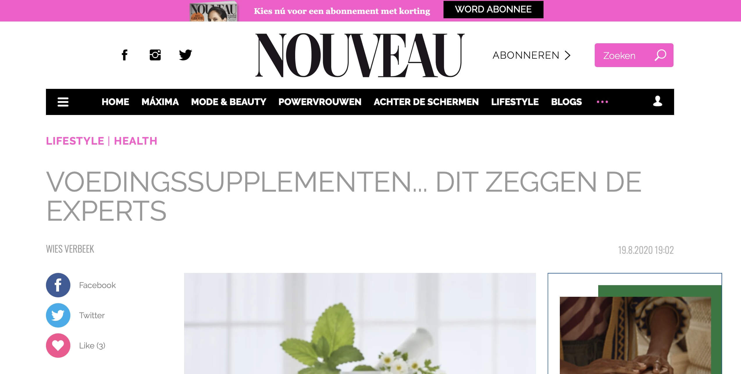 Geen onderwerp zo controversieel als voedingssupplementen. Moeten we nu van alles bijslikken of niet? NOUVEAU’s Wies vroeg zes experts naar hun eigen supplementenregime voor ons nieuwste nummer, dat nu in de winkels ligt.