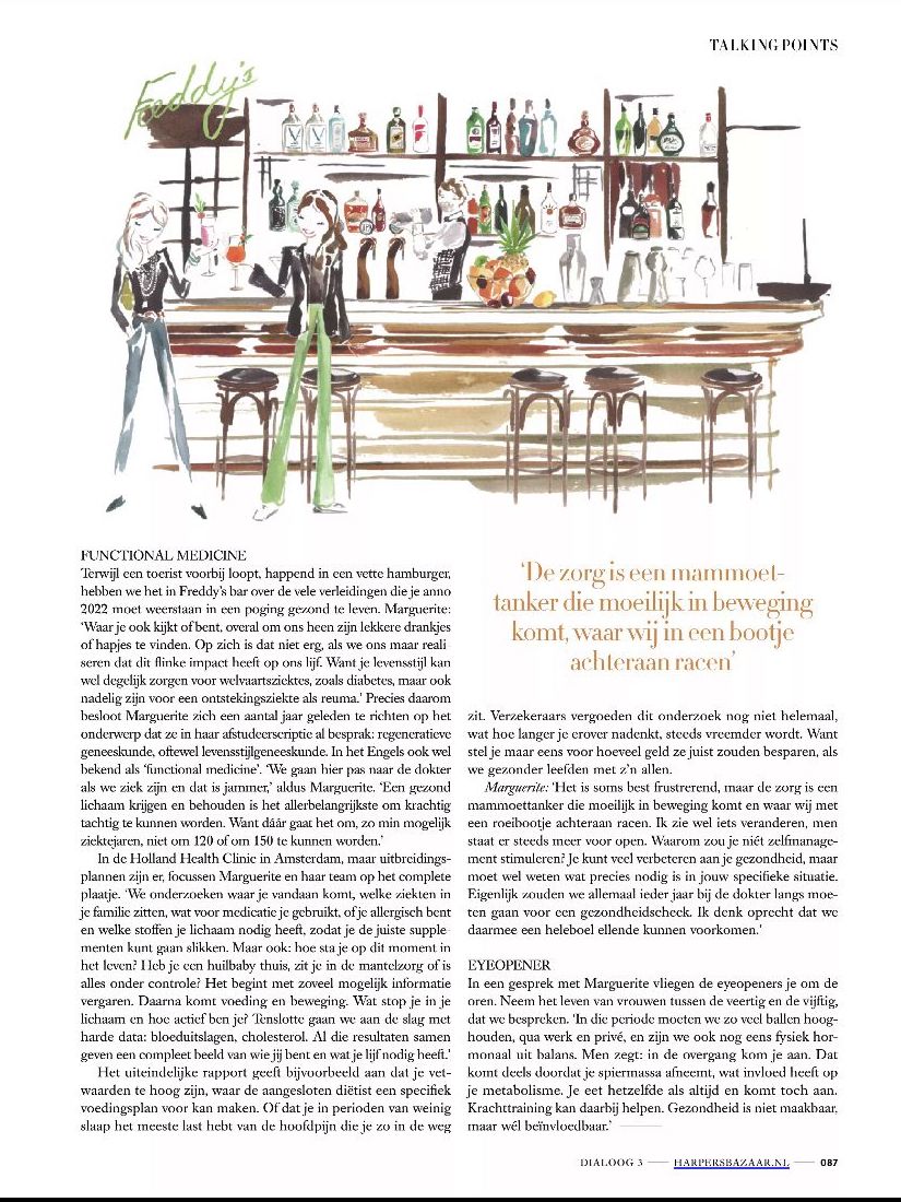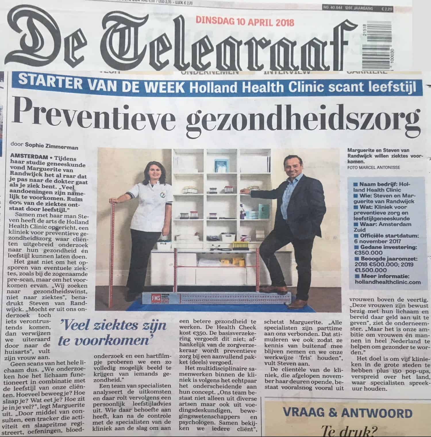 AMSTERDAM – “Ik vond het tijdens mijn studie geneeskunde al raar dat je pas naar de dokter gaat als je ziek bent”, vertelt Marguerite van Randwijck. Samen met haar man Steven richtte de arts de Holland Health Clinic op, een kliniek voor preventieve gezondheidszorg. “Want veel ziekten zijn te voorkomen. Cliënten kunnen dan ook bij ons een Health Check doen, die uitgebreid onderzoek naar hun gezondheid én levensstijl combineert. Deze check wordt door een team van specialisten geanalyseerd en daar rolt een persoonlijk leefstijladvies uit.”