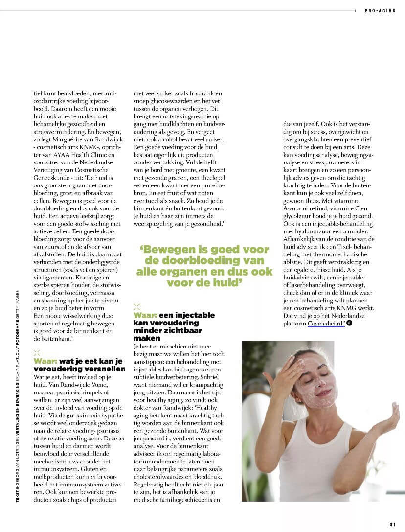Van krachtig tachtig naar krachtig én prachtig tachtig! Holland Health Clinic gaat samen met DokterMarguérite verder onder een nieuwe naam: AAYA Health & Cosmetic Clinic. Hier kan je vanaf nu terecht voor Health Checks, Hormone Checks, Droomgewicht consulten, leefstijlbegeleiding én cosmetisch geneeskundige behandelingen zoals huidverbetering, Tixelbehandeling, botulinetoxine (botox) en fillerbehandelingen (Profhilo, Restylane) en collageenboosters (Radiesse). En dat allemaal zowel in Amsterdam als in de Achterhoek (Lochem). Oprichter en arts Marguérite van Randwijck-Jacobze en Managing Director Elize van Ballegooie vertellen over het waarom van deze krachtenbundeling en de voordelen voor bestaande en toekomstige cliënten.
