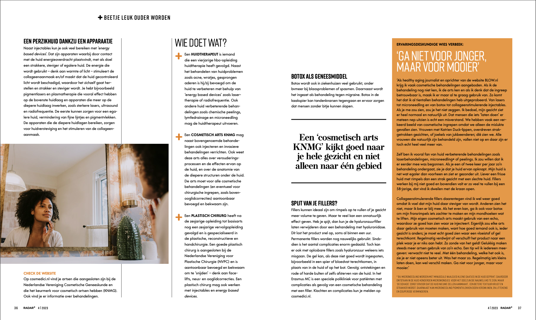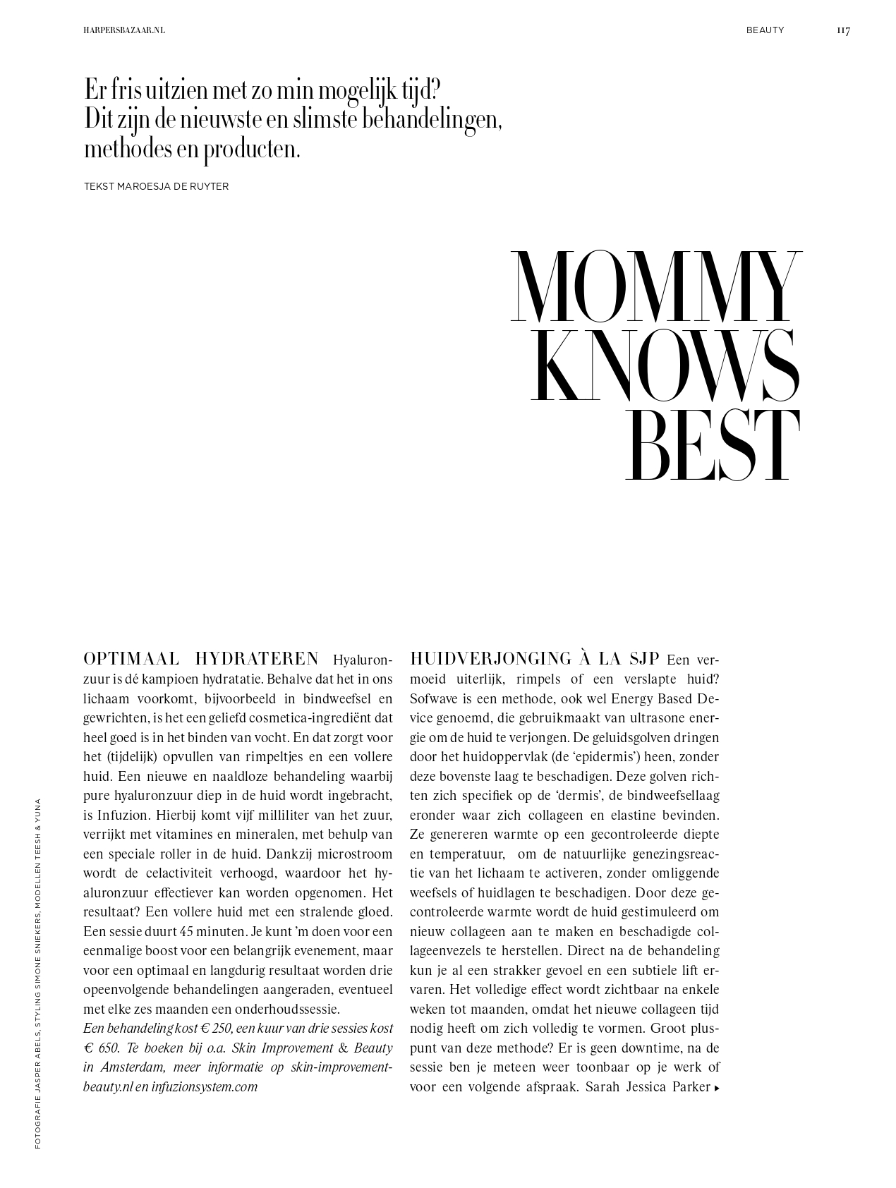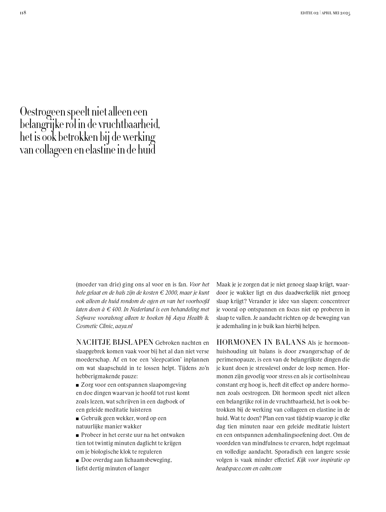 Toen ik hoorde dat de Sofwave-behandeling naar Nederland werd gehaald, stond ik vooraan in de rij. Het is een non-invasieve behandeling – kortom: geen naalden, geen onnatuurlijke middeltjes die ín je huid worden gespoten – die de aanmaak van collageen stimuleert. Niet voor een paar maanden, maar (als je relatief jong begint, zoals ik) voor jaren.